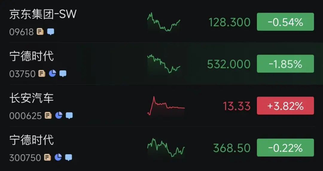截至10月16日发稿,京东集团(9618.HK)股价跌0.54%,A股宁德时代(300750.SZ)股价跌0.22%,H股宁德时代(3750.HK)股价跌1.85%,长安汽车(000625.SZ)股价上涨3.82%。
