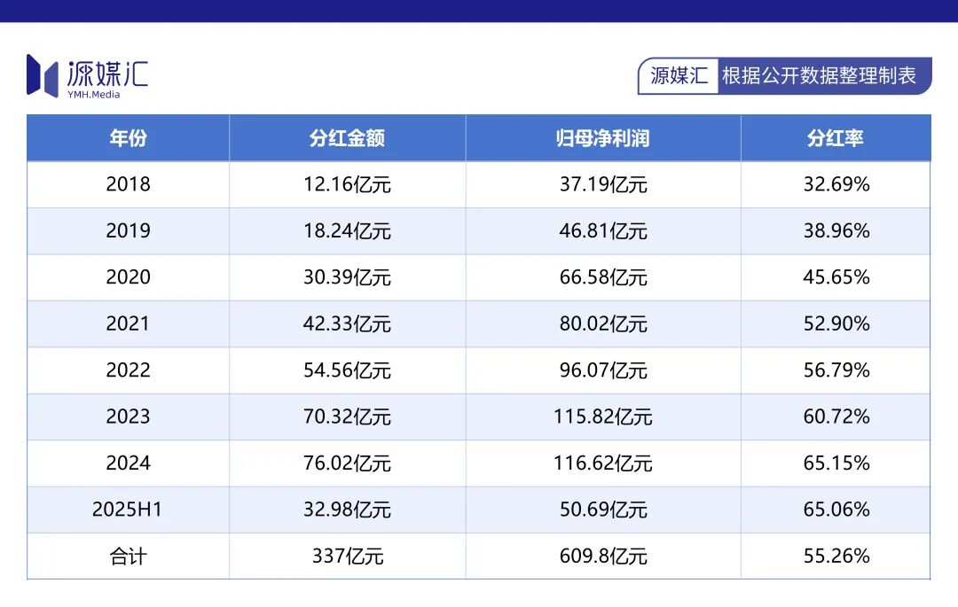 A股上市7年多以来,迈瑞医疗累计分红金额高达337亿元,是其上市融资金额59.3亿元的5.7倍。这种“赚钱能力强、分红比例高”的特质,与多数企业上市“补血”的目的形成鲜明对比。