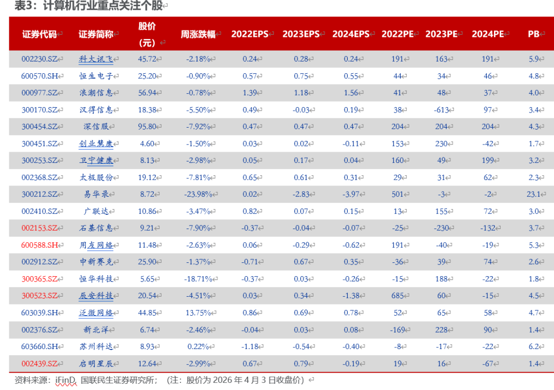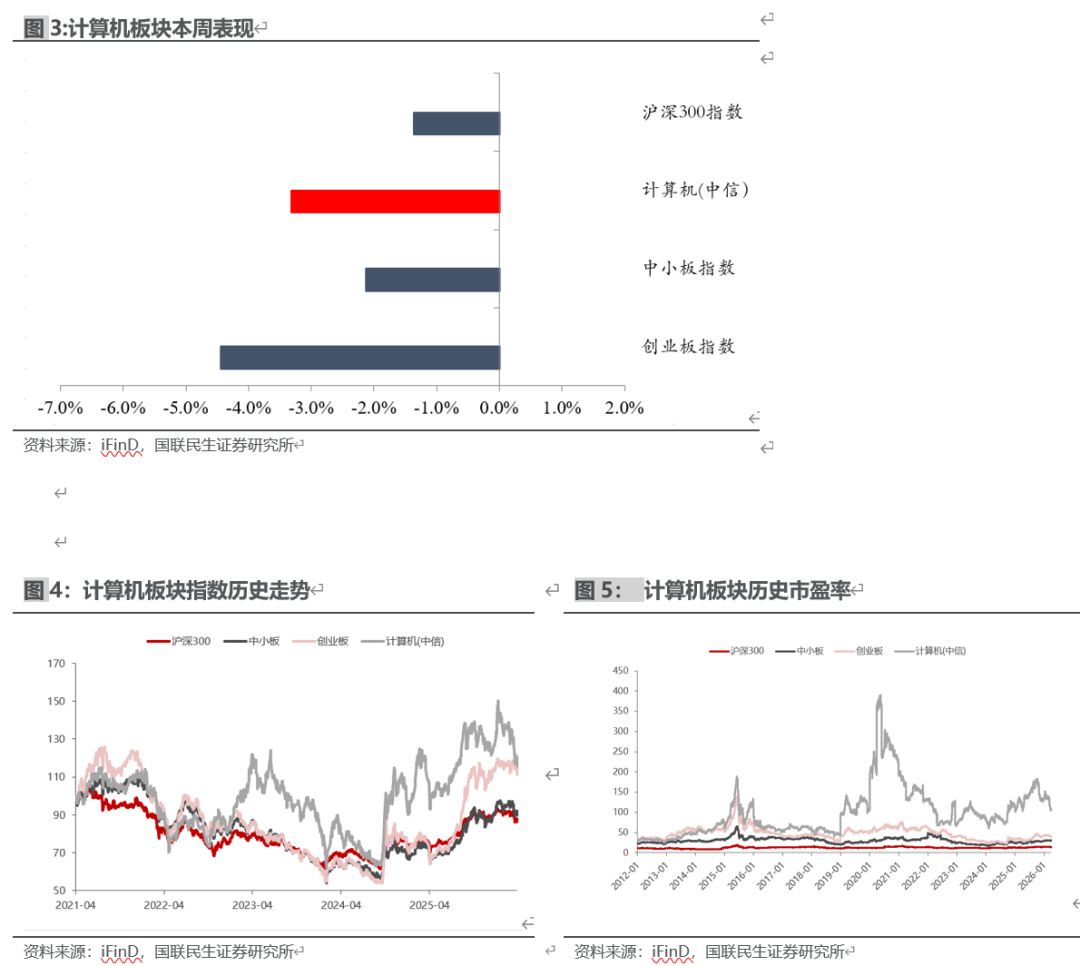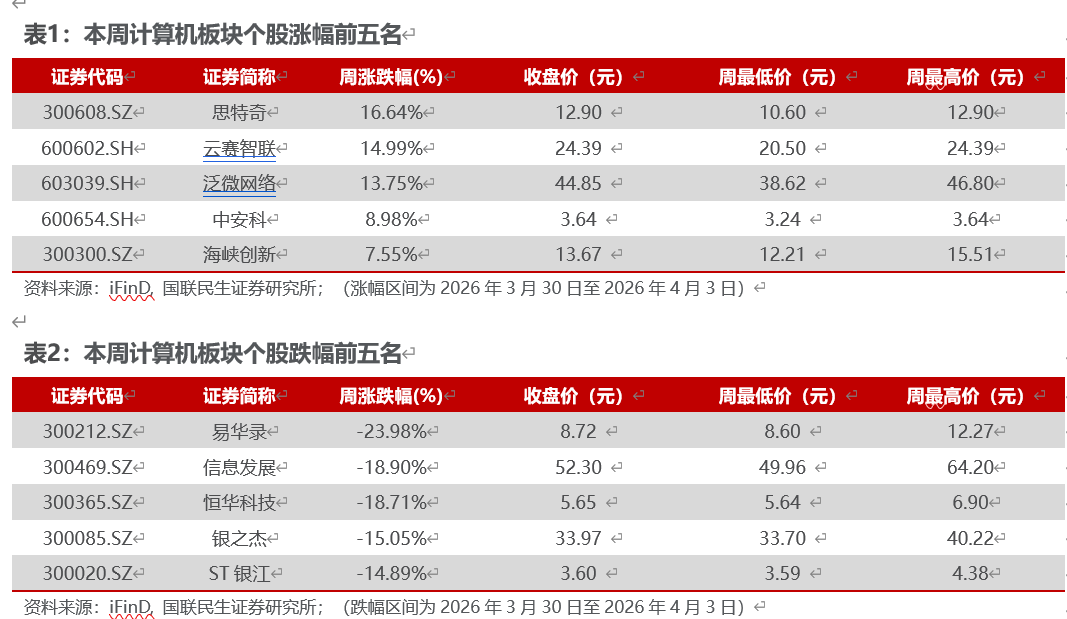 本周(03.30-04.03)沪深300指数下跌1.37%,中小板指数下跌2.13%,创业板指数下跌4.44%,计算机(中信)板块下跌3.32%。板块个股涨幅前五名分别为:思特奇、云赛智联、泛微网络、中安科、海峡创新;跌幅前五名分别为:易华录、信息发展、恒华科技、银之杰、ST银江。