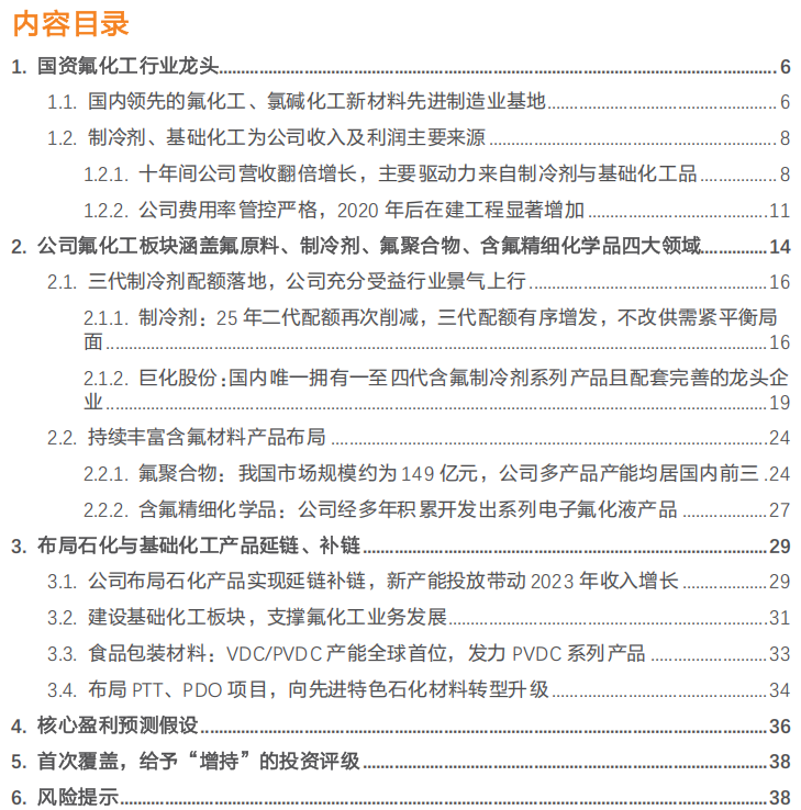 5、新项目建设不达预期风险:公司制冷剂板块、石化板块、氟聚合物板块、氟精细化学品板块均有在建项目,项目为公司未来增长点之一,若建设进度过慢或不及预期将对业绩产生影响。