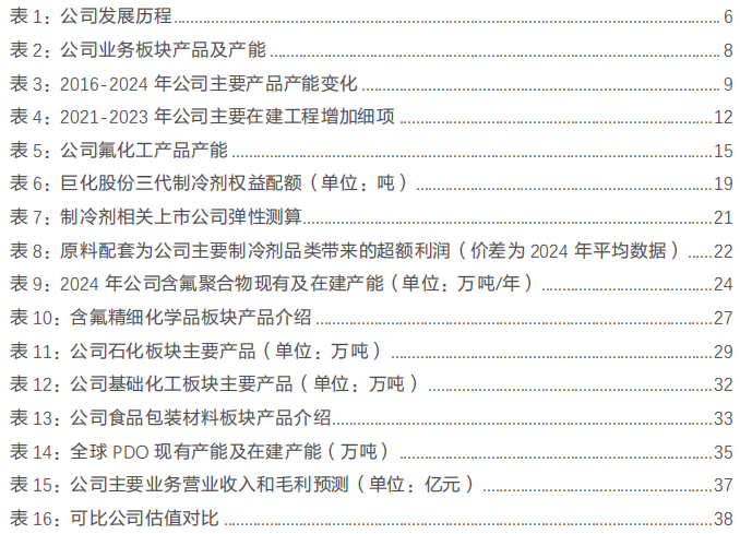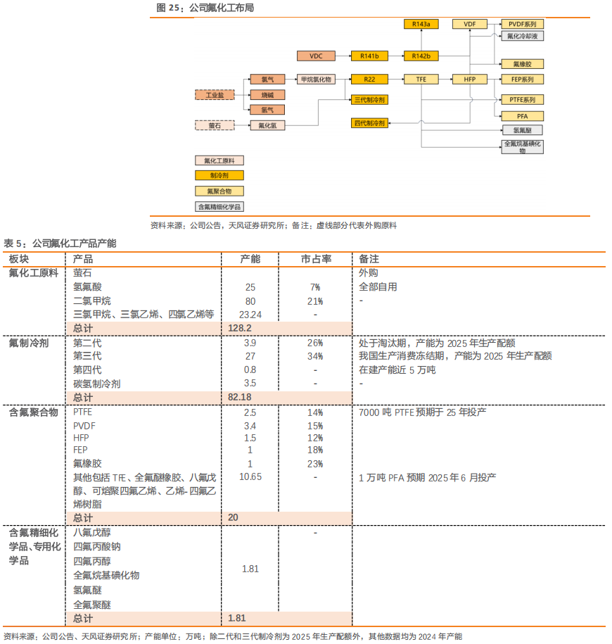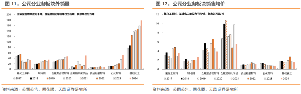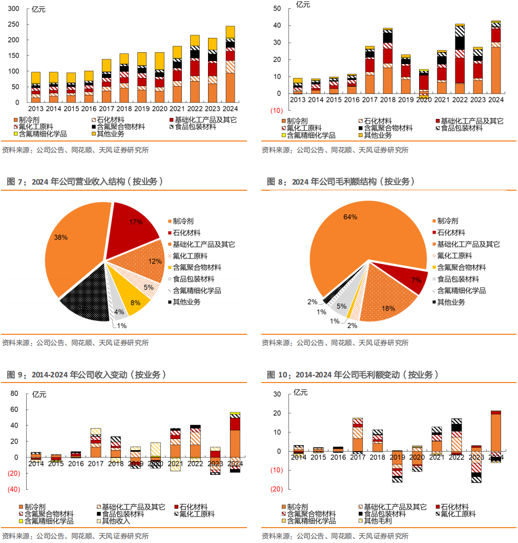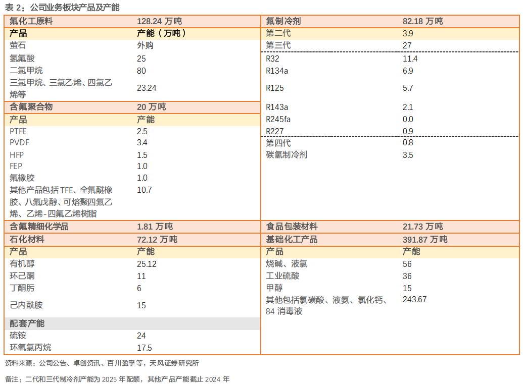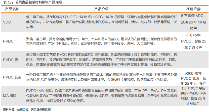 公司产品可分为七大类,除氟化工原料、含氟精细化学品、制冷剂外,基础化工产品、含氟聚合物材料、食品包装材料、石化材料均有新增产能,且或将于2025-2026年逐步投产。