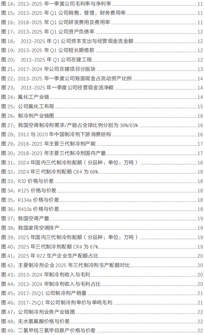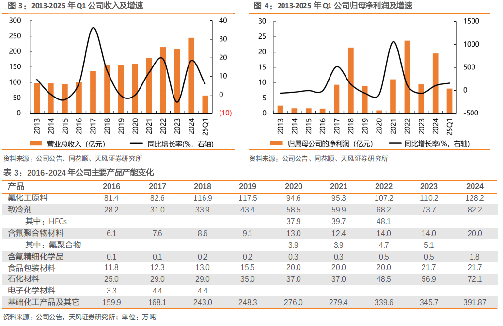 2025年一季度:2025年一季度,公司实现收入58亿元,同比 6%,实现归母净利润8.1亿元,同比 161%。一季度氟化工和石化材料产品增产增销,二代制冷剂因今年生产配额削减产品价格上涨,第三代氟制冷剂(HFCs)因实行生产配额制、上年度对厂库和社会库存消化充分且下游需求旺盛导致产品价格持续上涨;非制冷剂产品总体竞争激烈,产品价格同比下降或低位同比反弹。