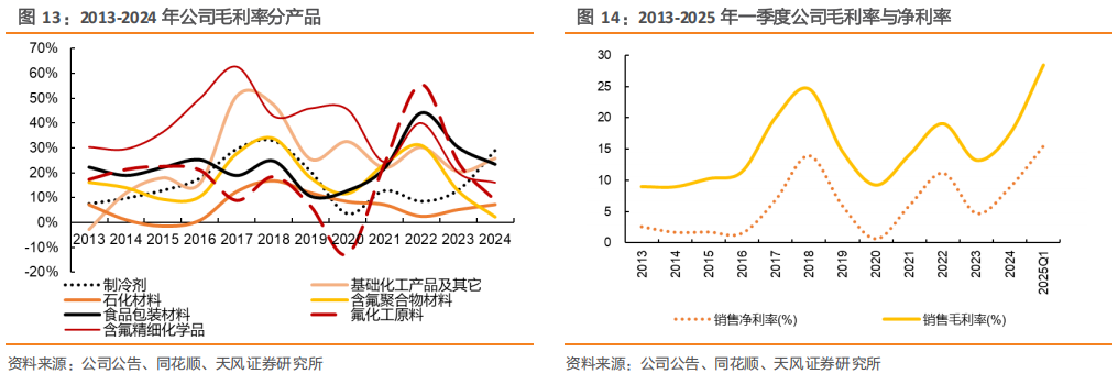 2024年: 2024年,公司实现收入245亿元,同比 18%,毛利43亿元,同比 47%,归母净利润19.6亿元,同比 108%。年内毛利总额同比增加15.5亿元,其中制冷剂毛利增幅最大,同比增加19.5亿元,主要原因为公司第三代氟制冷剂正式进入生产配额管控期,竞争格局、供需格局发生根本性变革。公司非氟制冷剂业务同步于行业趋势,“供强需弱”、竞争激烈、价格持续下跌,业绩持续承压。氟聚合物材料、食品包装材料、基础化工产品均价同比分别下跌16.71%、14.14%、14.27%。