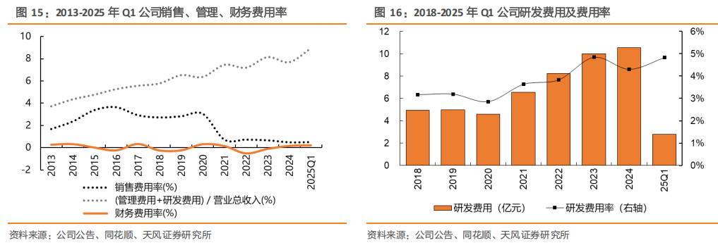 公司严格管控费用,2013年以来期间费用率低于10%。公司财务费用率长期低于1%;2018-2025年一季度公司管理费用率在2%-4%之间(2025年一季度为4.1%,不包括研发费用);销售费用率自2021年来持续维持在1%以下;而公司研发费用率长期维持在3%-5%之间(2020年为2.9%)。