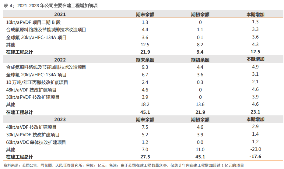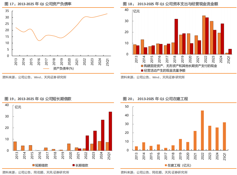 2021~2023年,虽公司经营现金流金额改善明显,但公司大量启动氟化工板块等项目投资(表4),资本开支显著加大(2021~2023年资本开支分别为17/35/30亿元,在建工程分别为22.2/45.5/28亿元),随之上升的是公司长期借款金额,2020年仅为0.04亿元,但2021-2023年增加至1.9/13.3/17.4亿元。2024年公司资本开支有所收窄,为19亿元,2025年一季度为1.2亿元。
