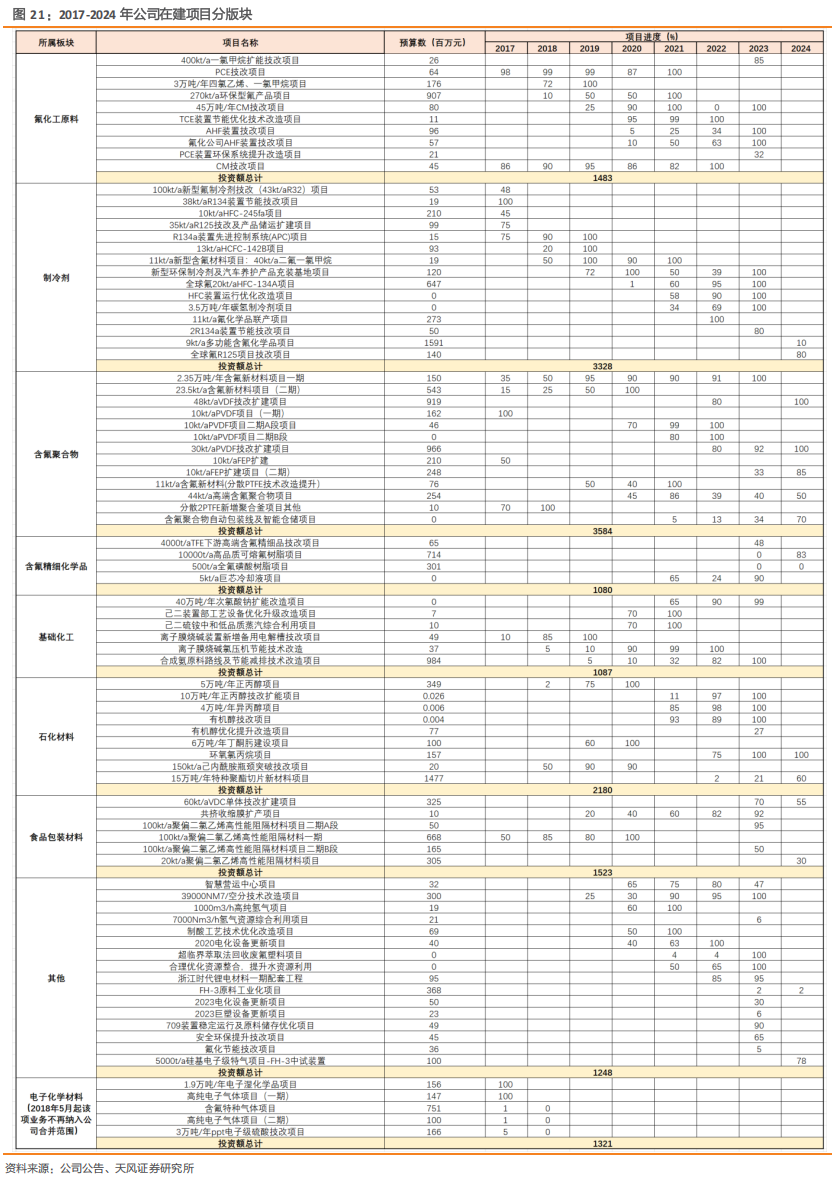 2025年安排固定资产投资项目31项。根据公司2024年年报,2025年计划投资额为77.26亿元、用款为78.47亿元,公司将重点实施好高性能氟氯新材料和含氟精细化学品项目建设,以及重点产品的挖潜、提质、增加品种、节能降耗、清洁技术改造。持续推进“三零”工程迭代升级,提升数智赋能水平。