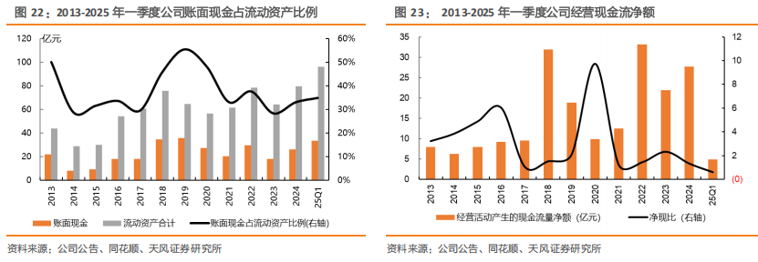 2013-2025年Q1公司流动资产结构良好。2013-2025年Q1公司货币资金与金融性经营资产占流动资产比例在28%以上,2025年一季度为33.6亿元,占流动资产比例为35%。公司净现比常年高于1,2024年经营活动现金流净额为27.65亿元,当年净利润为21.77亿元,净现比为1.3。