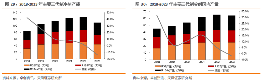 我国HFCs需求量占全球近四成。据Research and Markets,全球制冷剂需求量将从2024年的202万吨提升至2029年的229万吨,复合增速为2.5%,据此复合增速倒推,2023年全球制冷剂市场需求量约为197万吨。据Mordor Intelligence,2023年我国制冷剂需求约占全球的40%,故海外和我国的制冷剂需求量约为118万吨和79万吨。而以空调制冷剂为例,《2022-2028 年中国制冷剂行业现状调研分析与发展趋势预测报告》显示,全球制冷剂需求量的38%来自中国,65%的制冷剂产能在中国。