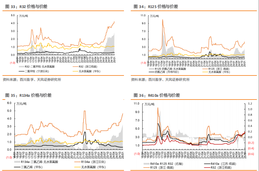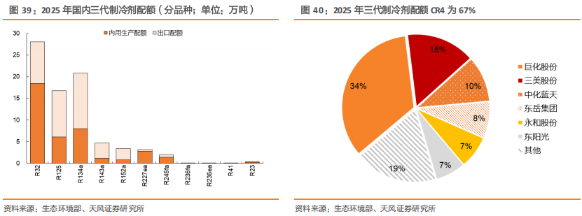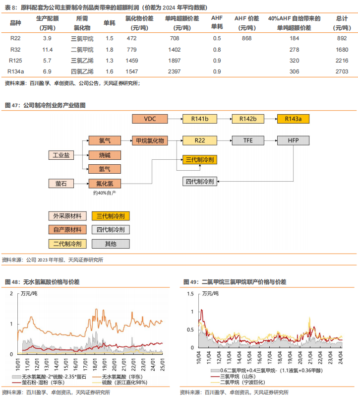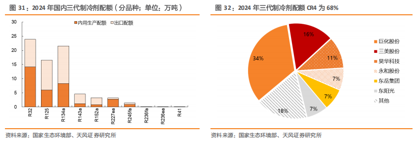 2024年我国三代氟制冷剂进入生产配额期,配额落地带来供给端集中度提升,在下游家用空调旺盛需求的助力下,主流品种价格价差较23年大幅上行。2025年三代制冷剂生产配额有序增发,考虑R22削减带来的空调换新需求、空调出口增长及行业竞争秩序改善,我们认为配额增发不会冲击行业供需紧平衡。2025年,公司三代制冷剂权益生产配额27.1万吨(不包括R23),市占率34%(行业第一),且主流三代制冷剂配额市占率领先,R32/R125/R134a占公司总配额42%/21%/25%,占国内总配额的41%/34%/33%,将有望充分受益于行业景气度的持续上行。