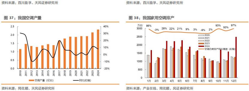 配额落地后,2024年三代制冷剂价格快速上行。主流品种R32/R125/R134a 2024年均价分别为3.2/3.7/3.5万元/吨,较2023年上行119%/46%/39%;全年平均价差分别为1.9/2.1/2.0万元/吨,较2023年上行898%/125%/147%,三代制冷剂盈利水平得以大幅改善。除配额落地带来的供给端集中度提升外,下游家用空调的旺盛需求也为价格上涨提供助力,根据国家统计局数据,2024年空调产量2.3亿台,同比 8.1%。