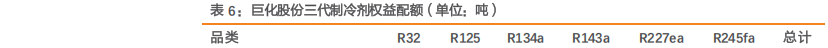 公司二代制冷剂权益配额3.9万吨,行业第一,市占率为26%;三代制冷剂共有27.1万吨生产配额(不包括R23),市占率34%,且主流三代制冷剂配额市占率领先,R32/R125/R134a占公司总配额42%/21%/25%,占国内总配额的41%/34%/33%;若从二氧化碳排放量总额控制角度,内部可调整空间也更大。