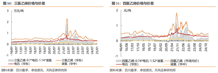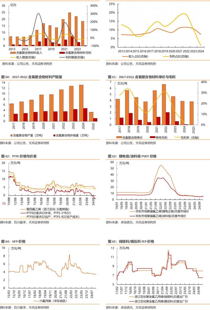 2023-2024年含氟聚合物存在供需压力,价格大幅下行。2023年含氟聚合物收入为22.1亿元,同比-11.5%,收入占比为11%;毛利为2.8亿元,同比-63.7%,毛利占比为10%;板块毛利率为12.7%,同比减少18.3个百分点。2023年含氟聚合物产销量分别为12.81/4.4万吨,同比有所增长(为经营数据),单价与单吨毛利分别为4.7万元/吨、0.6万元/吨,同比分别下滑30%、71%。根据卓创资讯数据,2023年PTFE单价为4.4万元/吨,同比下滑13.0%;锂电级PVDF单价为10.4万元/吨,同比-77%,PTFE与PVDF是氟聚合物的代表品种,价格下滑表征通用含氟聚合物产品承受了产能释放、需求增长缓慢的压力。2024年含氟聚合物产量同比 3%,外销量同比 7%,但价格持续弱势,板块均价为3.9万元/吨,同比-17%。25Q1量增价减趋势持续,氟聚合物单价-6.3%,外销量 10%。