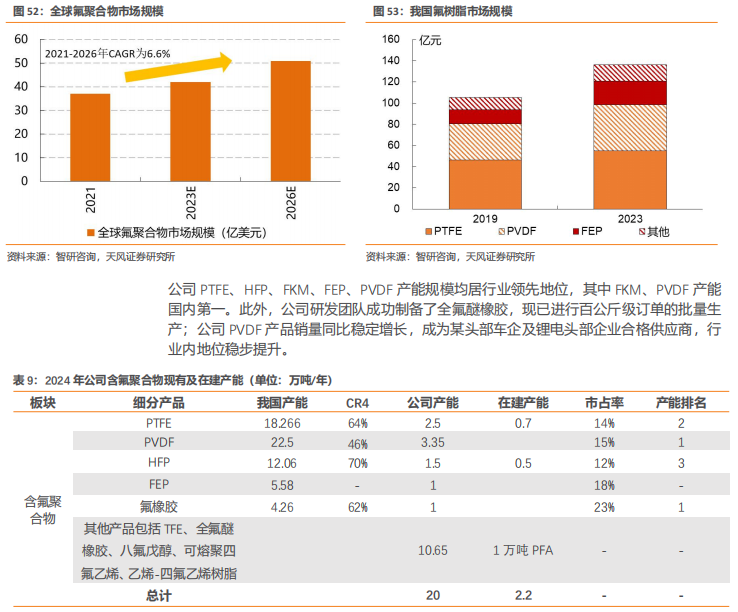 公司多个氟聚合物产能居全国前三,经多年研发开发出系列电子氟化液。
