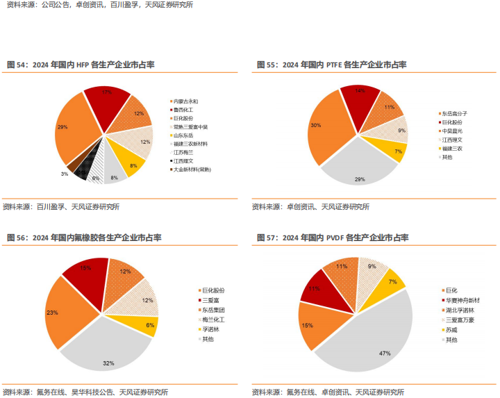 根据权益配额计算,三代制冷剂行业CR4为68%。2024年1月11日,生态环境部发布关于2024年度消耗臭氧层物质和氢氟碳化物生产、使用和进口配额核发情况的公示。6月13日,中国保护臭氧层行动网站发布《关于阿科玛(常熟)氟化工有限公司等13家企业2024年度含氢氯氟烃和氢氟碳化物生产配额调整的公示》,共有11家企业进行三代制冷剂配额调整。由于配额企业较多,故统计巨化股份、三美股份、中化蓝天、东岳集团、永和股份、东阳光6家主要制冷剂企业配额,6家企业权益生产配额市占率为82%,权益生产配额前四名分别为巨化股份/三美股份/中化蓝天/东岳集团,市占率分别为34%/16%/11%/7%,行业CR4为68%。
