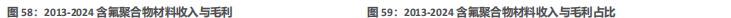 含氟聚合物收入占比相对稳定,盈利能力波动较大。2013-2023年含氟聚合物收入稳步增长,复合增速为11.9%,收入占比在7-12%之间。2013-2023年含氟聚合物毛利复合增速为9.3%,但毛利波动大,2022年含氟聚合物毛利占比为19%,为历史最高值,主要原因为经历2019年、2020年较大幅度的调整后,在经济回升、新能源高增长以及上游原材料上涨的影响下,产品价格连续2年恢复性上涨。