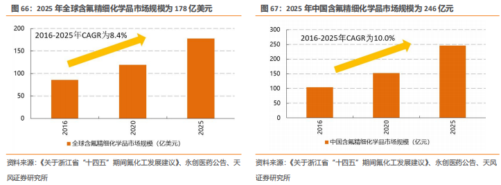 2025年全球/中国含氟精细化学品市场规模分别为178亿美元/246亿元,中国复合增速高于全球。