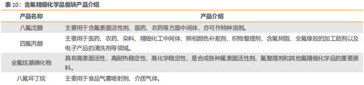 含氟精细化学品主要包括含氟医药、含氟农药、含氟染料、表面活性剂、织物整理剂、液晶材料等,产品附加值高、种类丰富、用途广泛,具有较大的发展空间。虽单品规模较小,但品种多,技术含量和附加价值高,性能独特、不可或缺,国内空白品种较多,将随产品研发和应用拓展具有良好成长空间。