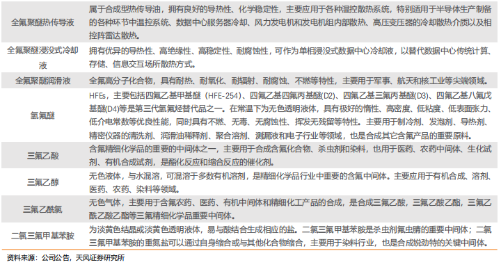公司现有PTFE、PVDF、FEP、FKM、PFA、ETFE等系列含氟聚合物产品,产能规模、品种处于国内领先地位。含氟精细化学品领域,公司经过十多年的技术研发积累,已开发出氢氟醚D系列产品和全氟聚醚JHT系列等电子氟化液产品。