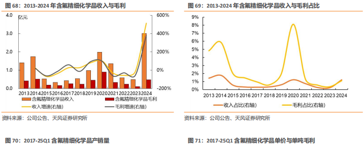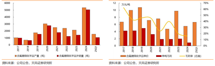 2024年,含氟精细化学品收入3亿元,同比 514%,毛利0.5亿元,同比 380%,产量为5346吨,同比 149%,外销量为5054吨,同比 255%,板块均价为5.5万元/吨,同比-44%,收入毛利及产量大幅增加的原因为年内公司完成收购淄博飞源化工有限公司股权变更登记,含氟精细化学品产能增加,价格下滑系合并后摊薄均价。25Q1外销量同比略减,单价同比 4.6%。