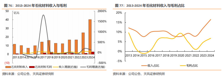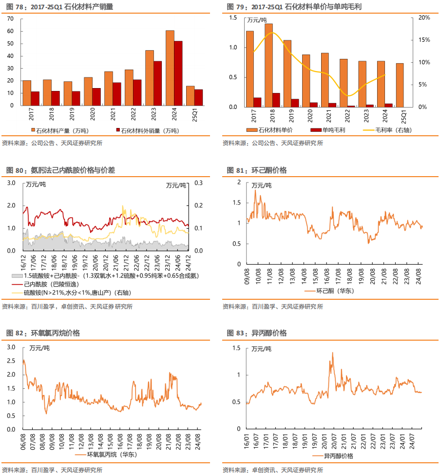 石化材料毛利占比波动较大,2023年新产能投产带动收入增长。2013年石化材料收入为11.9亿元,2023年为25.1亿元,复合增速为7.8%。2013年石化材料毛利为0.9亿元,2023年为1.3亿元,10年间石化材料盈利波动较大。2023年石化材料收入/毛利分别为25.1/1.3亿元,同比分别 48.4%、 202%,收入增长的主要原因为销量增长,2023年石化材料外销量为35.8万吨,较2022年增加15万吨,同比 71.9%,年内50kt/a正丙醇和5kt/a异丙醇产能投产,丙醇系列产品在国内市场占有率稳步提升,但石化材料单价同比下滑4.6%。2024年,石化材料收入40亿元(占比17%),同比 61%,毛利为2.9亿元(占比7%),同比 125%,产销量创新高,产量为61万吨,同比 36%,销量为52万吨,同比 46%,单价为0.8万元/吨,同比基本持平。25Q1,石化材料单价同比下滑9.3%,外销量同比 18%。