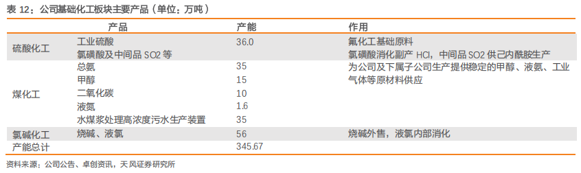 为配套氟化工板块,公司发展氯碱产品、煤化工产品、硫酸化工产品在内的基础化工板块。