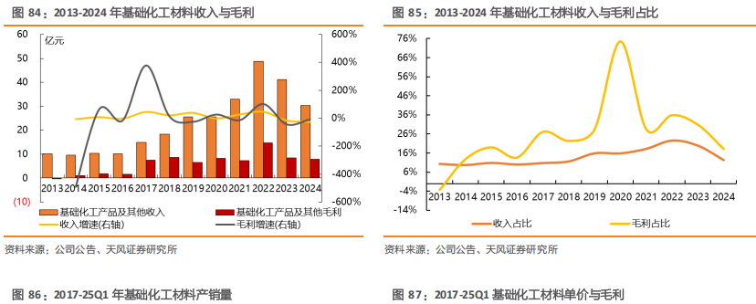作为周期产品,基础化工板块盈利波动较大。2013年基础化工产品收入为10.1亿元,2023年为41.3亿元,10年内收入复合增速为15.1%。2013年基础化工产品毛利为负值,2023年为8.4亿元,10年间基础化工产品盈利波动较大。2022年基础化工产品收入/毛利均为历史最高值,分别为48.7亿元、14.7亿元,同比分别 48%、 103%,收入与毛利占比分别为23%/36%,销量同比 4.9%,受供给侧结构性改革持续影响,化工行业供需格局持续改善,在“双碳”、“能源双控”政策下,经济回升、需求改善,产品价格突破前几年高点,2022年单价同比 41%。