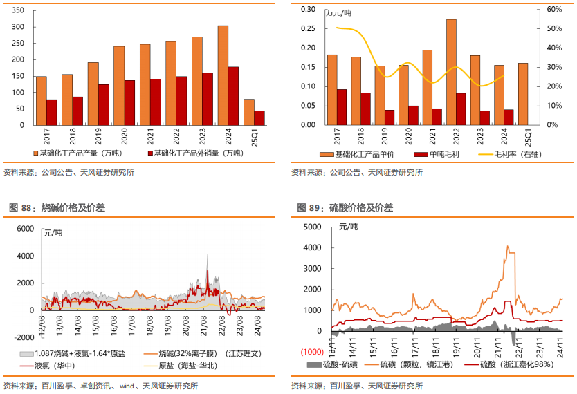 2023年基础化工产品收入/毛利分别为41.3/8.4亿元,同比分别-15%、-43%,年内销量虽然同比增长7.5%,但价格同比下滑34%。2024年前三季度板块单价为1553元/吨,同比下滑13%。进入四季度,公司部分化工产品已经历了近两年的深度下跌,价格下行风险得到较为充分释放,以烧碱为例,单四季度烧碱价格价差出现反弹,环比分别 11%/ 18%,全年来看,公司化工品产量为304万吨,同比 13%,外销量为178.5万吨,同比 12%,单价1553元/吨,同比-14.3%。25Q1产销持续同比增长,板块单价有一定恢复,同比上行19%至1613元/吨。