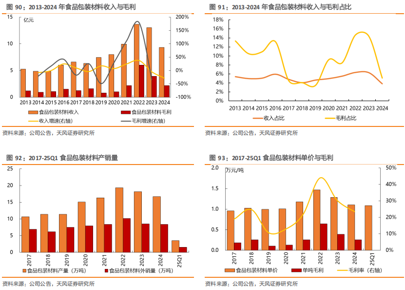 公司食品包装材料产销稳步增长,2023年受VDC市场需求下降影响产销降低。2013年产品包装材料收入为5.3亿元,毛利为1.2亿元,2013-2024年收入与毛利复合增速分别为5.3%/5.8%。2023年,公司食品包装材料收入/毛利分别为13.0/3.9亿元,同比-4.8%/-34.8%,主要原因是VDC市场需求下降,年内公司产销量分别-5.9%/-15.8%。2024年食品包装材料收入为9.3亿元,同比-28.5%,毛利为2.2亿元,同比-44%;全年产销量同比分别-8%/-2%,单价为1.1万元/吨,同比-14%。