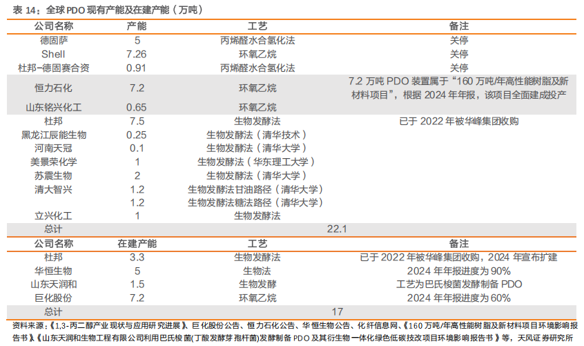 PDO现有与在建装置中,生物法为主流技术。截止2023年(部分上市公司工程进度数据来自2024年年报),根据不完全统计,全球PDO现有产能共计22.1万吨,生产厂家均为中国企业(华峰集团已于2022年完成对杜邦生物基产品相关业务的收购)。PDO工业化生产路线主要可分为化工法和生物法两大类,根据下表,化工法装置总产能为7.9万吨,生物法装置总产能为14.25万吨。全球PDO在建产能共计17万吨,其中仅有巨化股份7.2万吨采用化工法。