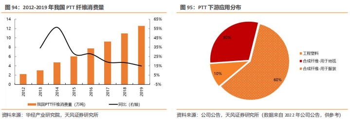 PTT可应用于合成纤维、工程塑料领域,性能优异,国内需求量在12-14万吨。PTT是一种性能优异的新型聚酯纤维材料和热塑性聚酯材料,国内年消费量大约在12-14万吨,其中90%用于合成纤维,10%用于工程塑料。分领域来看:1)用于生产合成纤维的PTT中1/3用于地毯行业,2/3用于服装行业。PTT纤维可以制成具有拉伸回复强力、轻柔手感的机织或针织弹性面料,可以广泛的用于高档服饰、泳衣、紧身衣等服装领域。PTT纤维具有较好的弹性、柔软性、蓬松性、抗污性,能够在常温下进行染色,用于地毯领域具有回弹性好、易染、色彩鲜艳、蓬松性好、抗污性好、吸水性低、清洗方便、耐磨等优点,并同时具有锦纶、腈纶、涤纶的优点,是综合性能良好的地毯纤维材料。2)PTT工程塑料兼具了聚对苯二甲酸乙二醇酯(PET)的强度、韧性、耐热性等物理性能以及聚对苯二甲酸丁二醇酯(PBT)的熔体温度低、结晶快的加工优势,是具有良好应用潜力的热塑性工程塑料,被应用于电子/电气、汽车、器具和家具市场。根据2024年年报,15万吨/年特种聚酯切片新材料项目工程进度为60%。