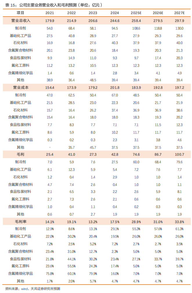 1)收入:假设2025-2027年氟化工原料板块单价、外销量与2024年保持一致。