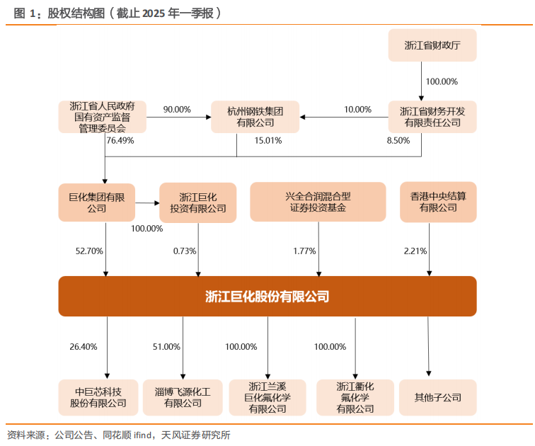 控股股东为巨化集团有限公司,实控人为浙江省国资委。巨化集团直接持有公司52.70%的股份,并通过全资子公司浙江巨化投资有限公司持有公司0.73%的股份,合计表决权比例53.43%。而浙江省国资委通过杭州钢铁集团有限公司、巨化集团有限公司直间接持股巨化集团股权48%,为公司实控人。