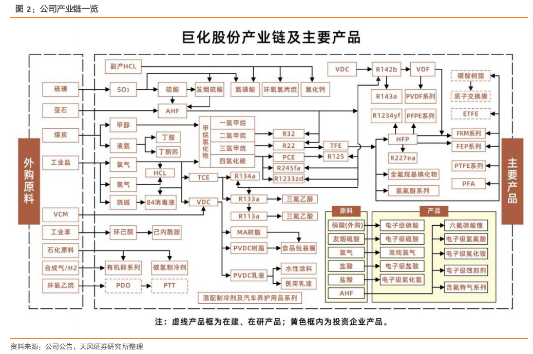 公司主要业务包括基础化工原料、食品包装材料、氟化工原料及后续产品的研发、生产与销售。公司拥有氯碱化工、硫酸化工、煤化工、基础氟化工等氟化工必需的产业自我配套体系,并以此为基础,形成了包括基础配套原料、氟制冷剂、有机氟单体、含氟聚合物、含氟精细化学品等在内的完整的氟化工产业链,并涉足石油化工产业。