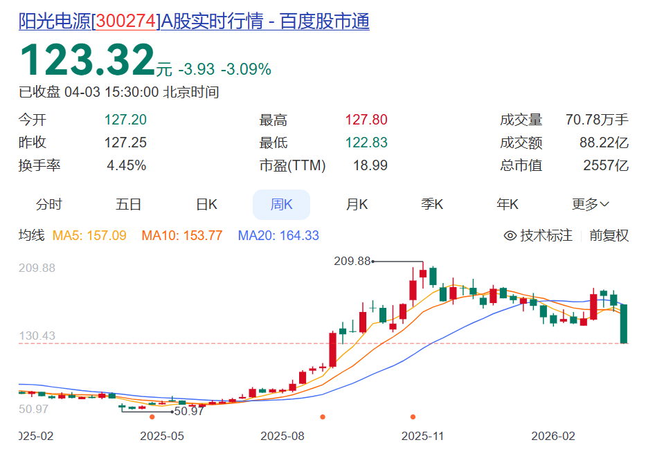 自2025年11月7日当周创下209.88元的历史新高,市值升到4350.81亿元以来,阳光电源最新市值已回落到2557亿元,5个月时间内最高蒸发了近1800亿元。