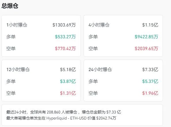 coinglass数据显示,最近24小时,加密币全网共有208860人爆仓,爆仓总金额为7.33亿美元(约合人民币52亿元)。