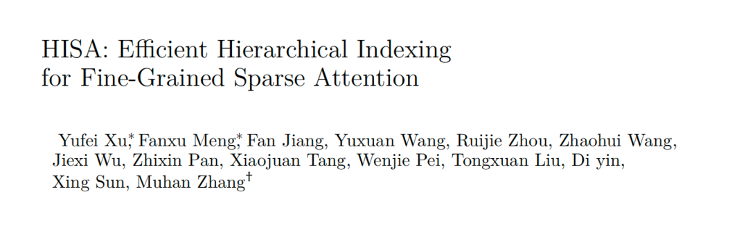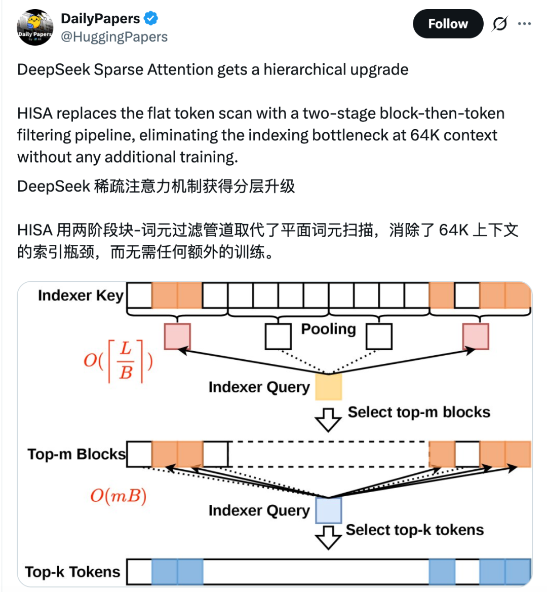 提出新稀疏注意力机制HISA(分层索引稀疏注意力),突破64K上下文的索引瓶颈,相比DeepSeek正在用的DSA(DeepSeek Sparse Attention)提速2-4倍。