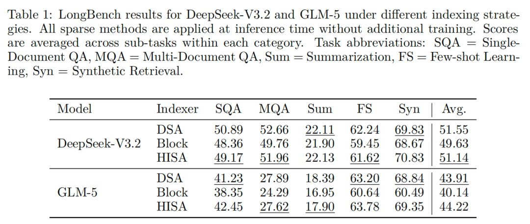在长文本理解(LongBench 基准)上,HISA的分数也和DSA基本持平。