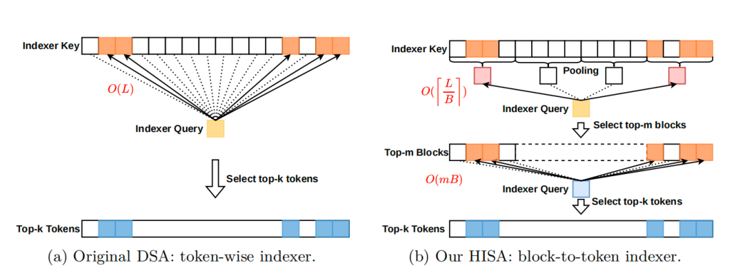 HISA把原索引器每一层 O (L²) 的算力成本,降到了O(L²/B L×m×B)(B 是块大小、m 是选的块数)。