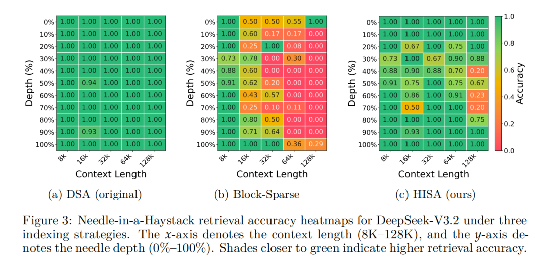 精度上,HISA也几乎完全保留原DSA的精度,且显著优于纯块稀疏方法。