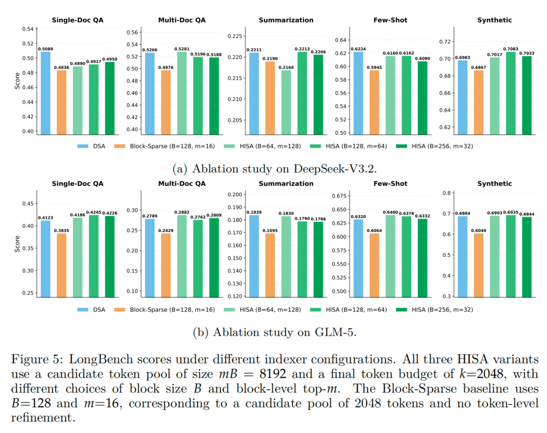 而在超参数测试中,不同块大小、选块数量下,HISA表现都很稳定,分数均与DSA高度接近,无显著性能差异。