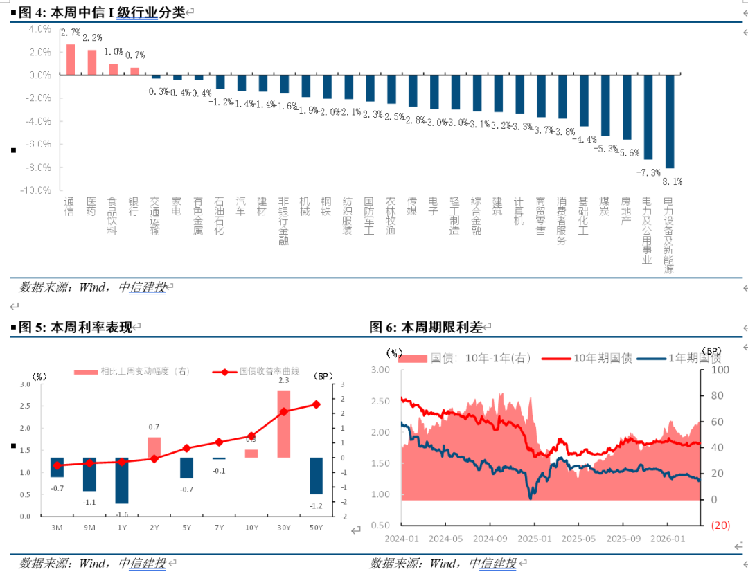 H股:本周港股市场表现完全跟随地缘事件节奏波动,周中市场随预期美伊冲突缓和而上涨,后续因预期破裂回落。受本周周中特朗普和伊朗方面表态略有缓和影响,市场风险偏好有所回升,前期调整幅度较大的医疗保健业、原材料业反弹。受周中油价下跌影响,能源业表现较弱。