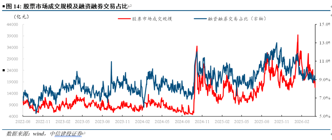 本周两市成交额缩减,当周平均日成交额为18850.76亿元,较前一周减少约2143.66亿元。融资融券交易金额占比有所下降。
