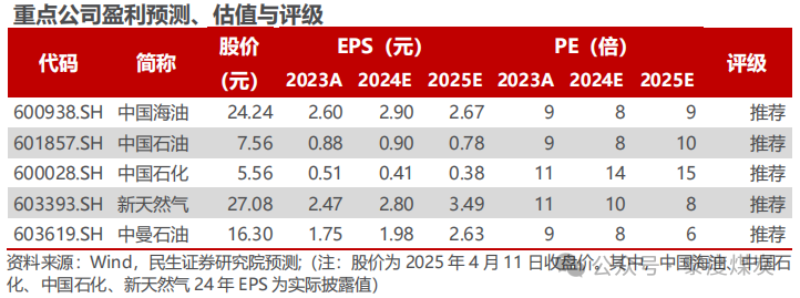 投资建议:我们推荐以下两条主线:1)油价有底,石油企业业绩确定性高,叠加高分红特点,估值有望提升,建议关注产量持续增长且桶油成本低的中国海油、抗风险能力强且资源量优势强的中国石油、高分红一体化公司中国石化;2)国内鼓励油气增储上产,建议关注产量处于成长期的新天然气、中曼石油。