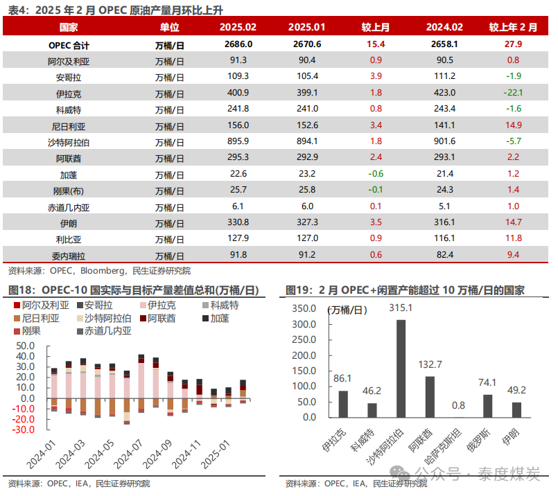 4月11日,金十数据报道,美国能源信息署(EIA)发布4月短期能源展望报告,对美国石化产业预测如下:(1)预计2025年美国天然气(干气)产量为1053亿立方英尺/日,此前预期为1051.8亿立方英尺/日。预计2026年美国天然气(干气)产量为1071亿立方英尺/日,此前预期为1074.9亿立方英尺/日。(2)预计2025年美国天然气消费量为910亿立方英尺/日,此前预期为920.1亿立方英尺/日。预计2026年美国天然气消费量为910亿立方英尺/日,此前预期为911.2亿立方英尺/日。(3)预计2025年天然气价格为4.3美元/百万英热,此前预期为4.19美元/百万英热。预计2026年天然气价格为4.6美元/百万英热,此前预期为4.47美元/百万英热。(4)预计2025年美国原油产量为1351万桶/日,此前预期为1361万桶/日。预计2026年美国原油产量为1356万桶/日,此前预期为1376万桶/日。(5)预计2025年美国石油需求为2040万桶/日,较之前预测的2050万桶/日有所下调;预计2026年需求为2050万桶/日,此前为2060万桶/日。4月11日,金十数据报道,标普全球商品洞察调查显示,在全球贸易紧张局势和欧佩克计划在第二季度逐步提高配额的推动下,欧佩克 产量在3月份创下八个月新高。3月份产量环比增长3万桶/日,达到4104万桶/日。这一增幅明显小于2月份,当时的产量环比激增了44万桶/日。此外,欧佩克在3月份将日产量削减了1万桶,至2684万桶。非欧佩克成员国的产量增加了4万桶/日,达到1417万桶/日。调查显示,欧佩克 配额生产国3月份产量比目标高出31.9万桶/日,而2月份产量比目标高出29.4万桶/日。”4