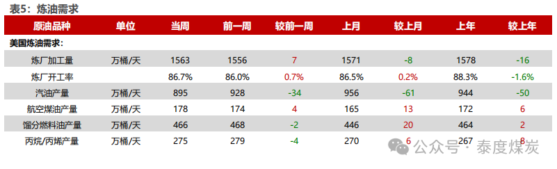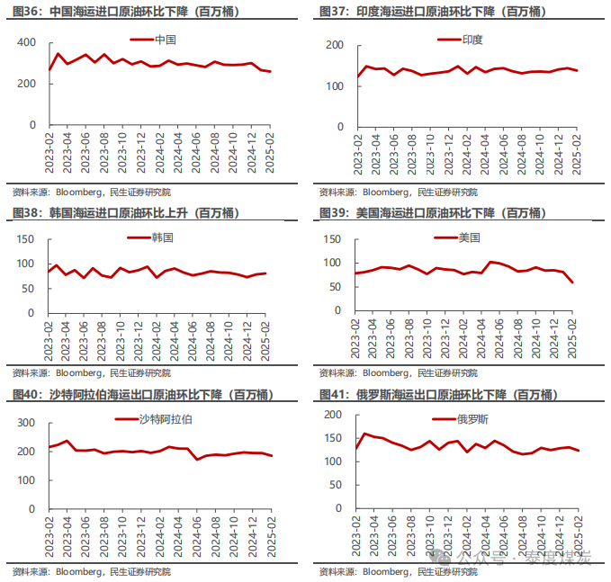 1)海运进口:中国260百万桶,同比下降9.6%,环比下降2.6%;印度139百万桶,同比上升5.6%,环比下降4.1%;韩国81百万桶,同比上升11.6%,环比上升2.4%;美国59百万桶,同比下降22.5%,环比下降26.9%。