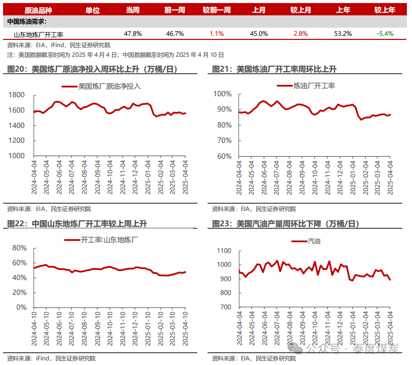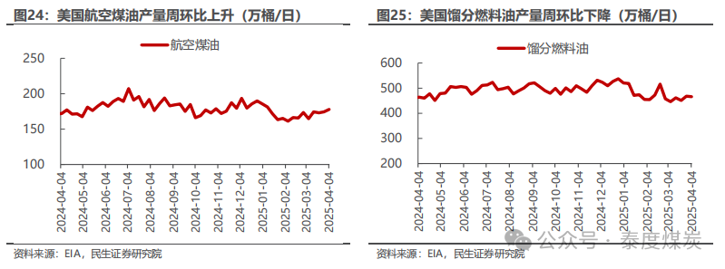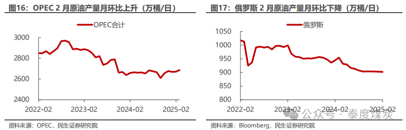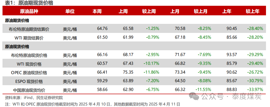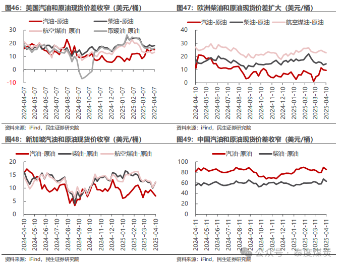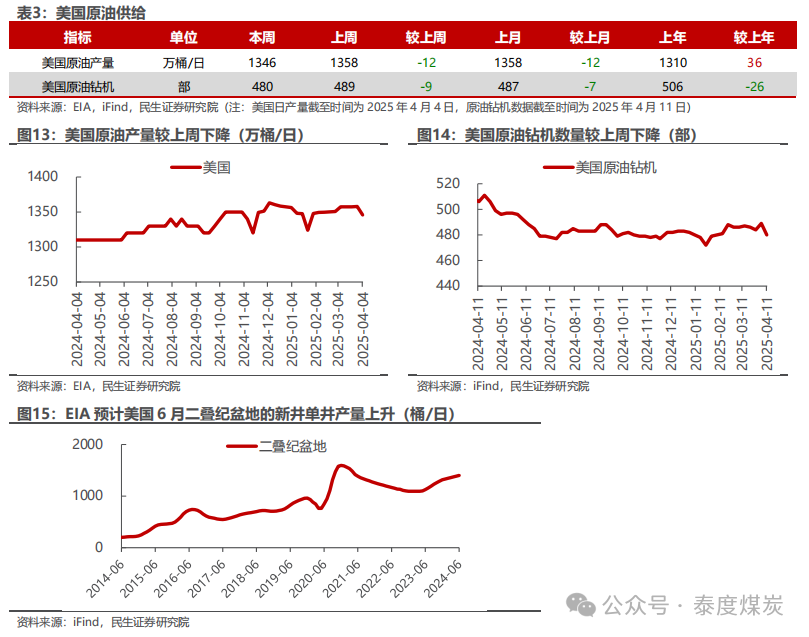 EIA大幅下调需求预期和美国产量增速预期,表明60美元是限制美国供给的较强支撑。EIA 4月月报显示,其预计25年全球供需情况从3月的过剩4万桶/日调整至过剩46万桶/日,主要是其对需求增速的预期下调了37万桶/日。1)需求:EIA预计25年全球石油需求为10364万桶/日,同增90万桶/日,增速水平相比上月预期下调37万桶/日;其中,美国、加拿大、日本、中国、印度需求增速分别下调7、3、3、5、3万桶/日。2)供给:EIA预计25年全球石油供给为10410万桶日,同增135万桶/日,增速水平下调4万桶/日;其中,美国供给增速下调17万桶/日,OPEC供给增速上调13万桶/日。从EIA的预测数据可见,当前油价(本周布伦特/WTI均价为64.1/60.8美元/桶)下美国产量增速预期被大幅下调,表明60美元已触及美国页岩油的边际成本,是油价较强的底部支撑;且本次布油价格在触及60美元/桶的底部后再次反弹,同时结合历史来看,仅2020年疫情、2015-2017年美国页岩油革命叠加OPEC抢份额打价格战时导致布油价格中枢低于60美元/桶,因此我们认为,若不考虑全球经济危机以及OPEC打价格战的可能影响,当前布油60美元/桶的底部是较为明确的。