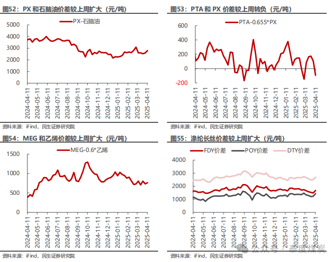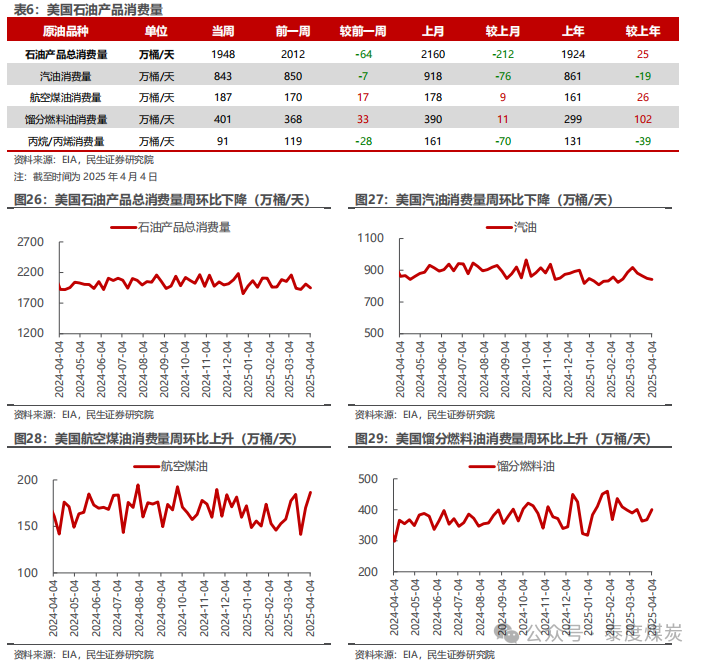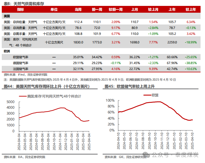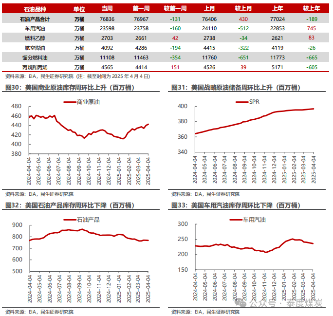 国际贸易背景扑朔迷离,油价大幅波动。4月2日,特朗普宣布4月5日开始对全球进口商品加征10%的基准关税,并于4月9日开始对部分经济体征收更高的税率,其中,对中国、欧盟加征税率为34%、20%;4月4日,中国回应4月10日开始对美进口商品同样加征34%关税;4月7日,欧盟回应计划对美实施两轮关税反制,预计分别于4月15日和5月15日开始;4月8日,美国政府再次宣布对中加征关税,税率由34%提高至84%。4月9日,中国宣布4月10日起同样将加征关税税率提高至84%,同日,欧盟成员国投票通过首轮对美关税反制措施,将对一系列美国产品征收高达25%关税,主要针对美方钢铝,并表示如果美国同意达成公平、平衡的谈判结果,反制措施可暂停。然而,4月10日凌晨,特朗普再度表示,将对75个未对美国采取报复行动的国家暂停实施“对等关税”计划90天,在此期间,这些国家对美出口商品的互惠关税将大幅降低至10%,此调整立即生效;与此同时,将对华加征税率再度提高41%,即将本次加征的84%税率提高至125%,同样立即生效。在国际贸易扑朔迷离的背景下,油价经历了大幅波动,起先因市场对全球经济危机的担忧,布伦特油价盘中最低回落至60美元/桶以下,而在特朗普宣布暂停关税后,油价大幅反弹至65美元/桶以上,后续则维持震荡。但目前,国际局势仍不稳定,4月11日,中国再次回应将加征关税税率由84%提高至125%,且美方后续如果对中国继续加征关税,中方将不予理会;而美方暂未有下一步行动。我们预计,关税行动或将对全球需求造成影响,但考虑到短期国际政治局势不稳,目前油价或维持震荡。