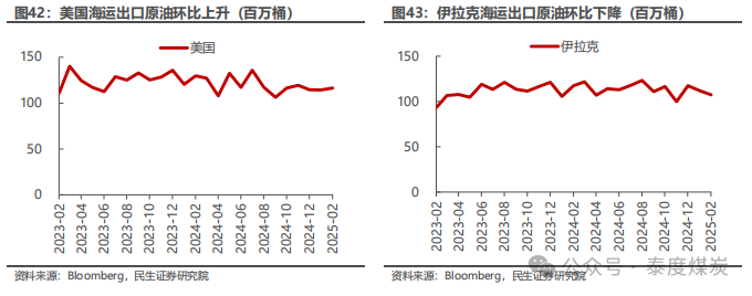 2)海运出口:沙特186百万桶,同比下降8.1%,环比下降4.8%;俄罗斯124百万桶,同比上升2.8%,环比下降5.3%;美国116百万桶,同比下降10.2%,环比上升1.8%;伊拉克107百万桶,同比下降8.7%,环比下降4.3%。