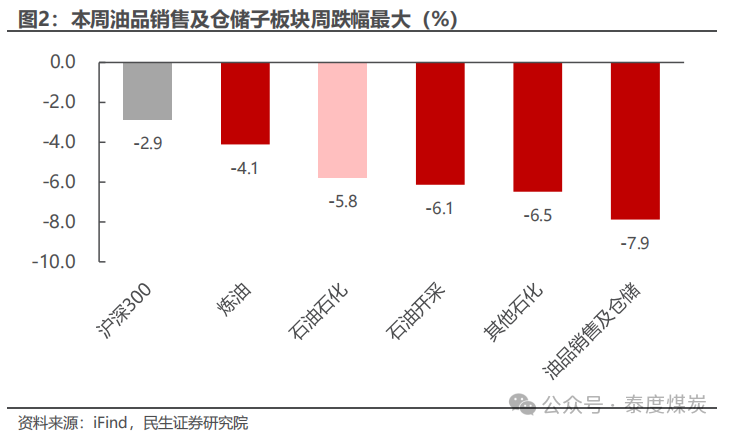 截至4月11日,本周沪深300下跌2.9%,中信石油石化板块下跌5.8%。各子板块中,炼油子板块周跌幅最小,为-4.1%;油品销售及仓储子板块周跌幅最大,为-7.9%。