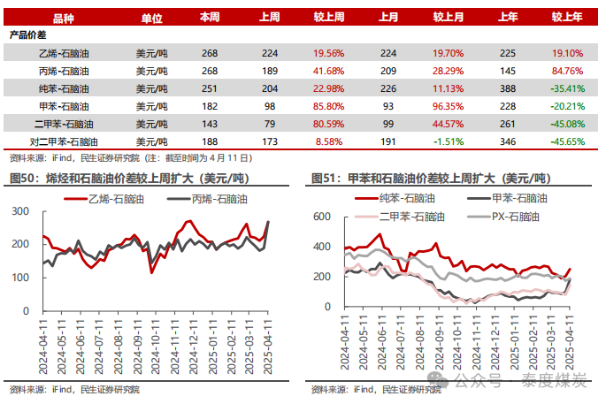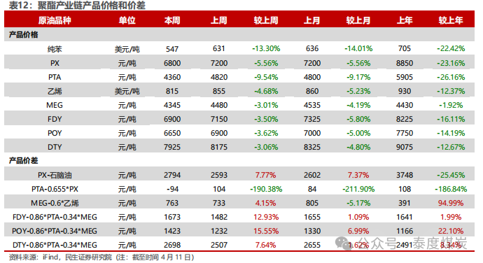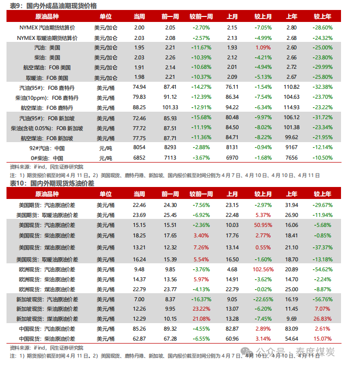 据iFind数据,截至2025年4月11日,国内汽柴油现货价格为8054、6852元/吨,周环比变化-2.88%、-3.67%;和布伦特原油现货价差为85.26、62.87美元/桶,周环比变化-4.55%、-6.55%。
